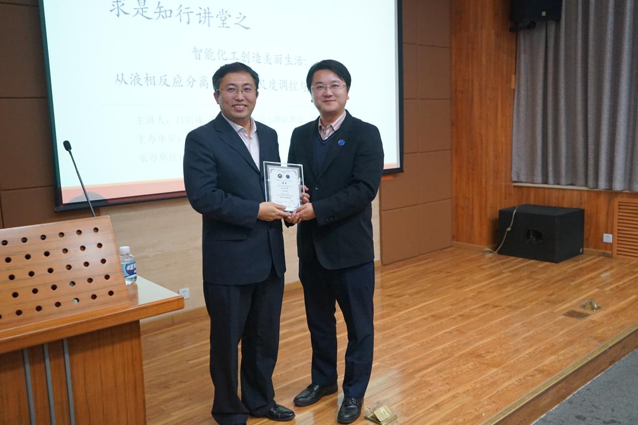 10月24日晚,bat365在线平台官网登录求是书院知行讲堂第五期在良乡校区工业生态楼报告厅举行。清华大学化工系长聘副教授、博士生导师吕阳成教授带来题为“智能化工创造美丽生活——从液相反应分离过程的微尺度调控与强化谈起”的专题报告。北理工求是书院副院长周芳集老师出席了报告会,并为吕阳成教授颁发了求是书院校外导师聘书,来自求是书院、化学与化工学院的80余名同学聆听了报告会。报告会由求是书院团委书记、综合办公室主任张锋老师主持。