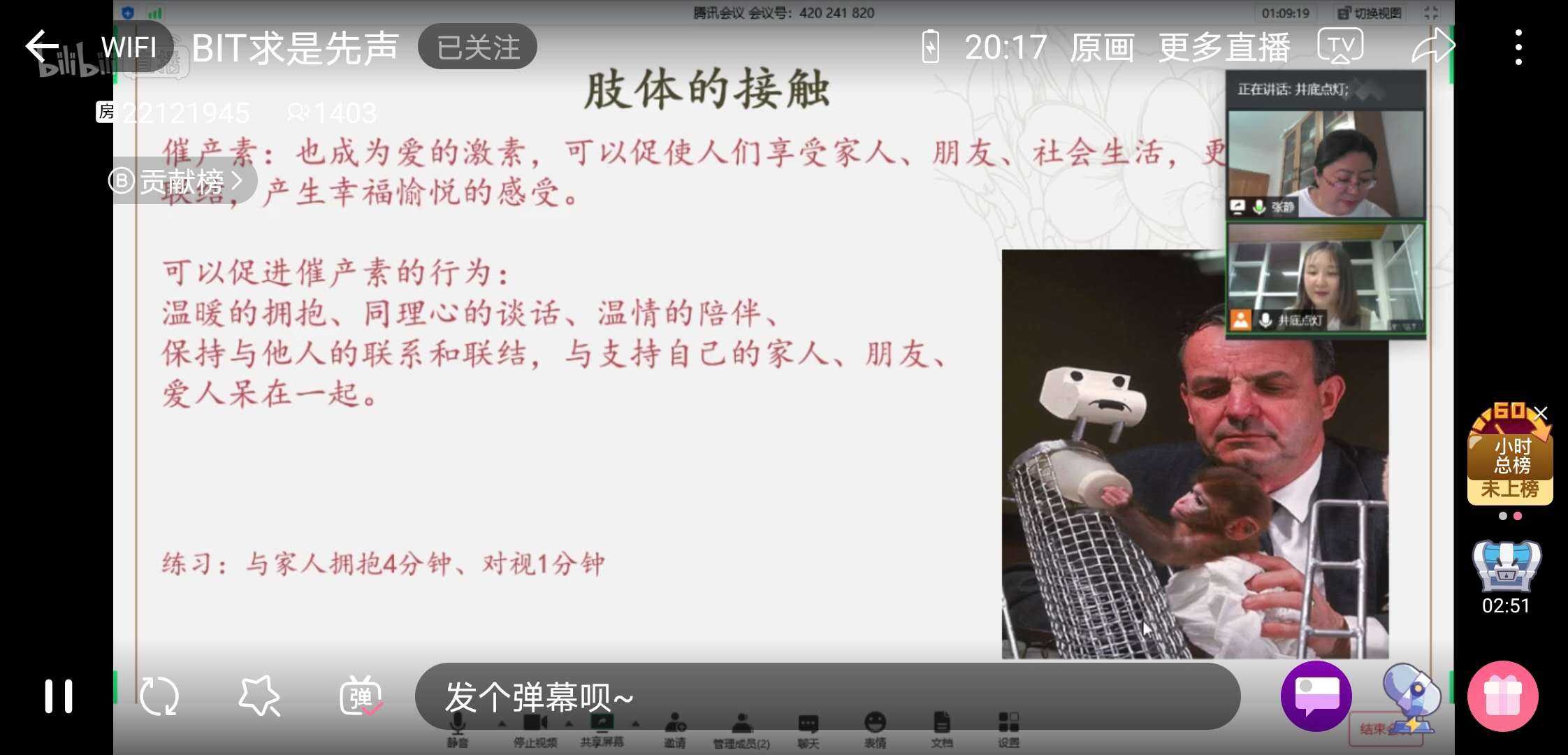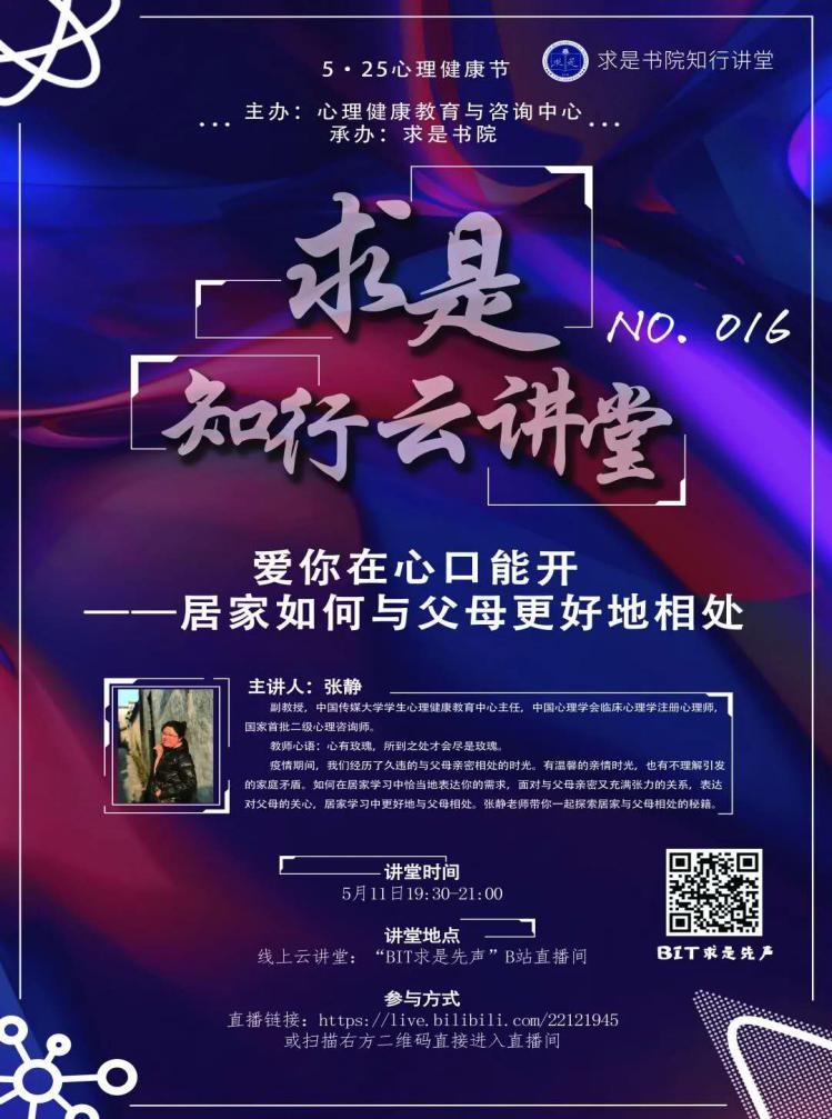 5月11日,由bat365在线平台官网登录心理健康教育与咨询中心主办、求是书院承办的,5·25心理健康节特别讲座“求是知行云讲堂第十六期——爱你在心口能开”在B站平台与求是书生直播见面。中国传媒大学学生心理健康教育中心主任张静副教授作为主讲人,通过直播的方式为北理学子带来了一场关于疫情期间在家如何与父母相处的精彩的讲座。