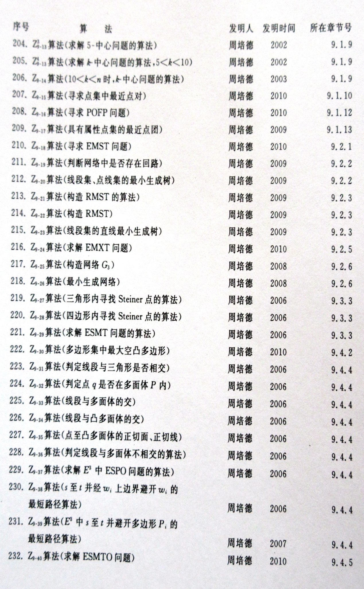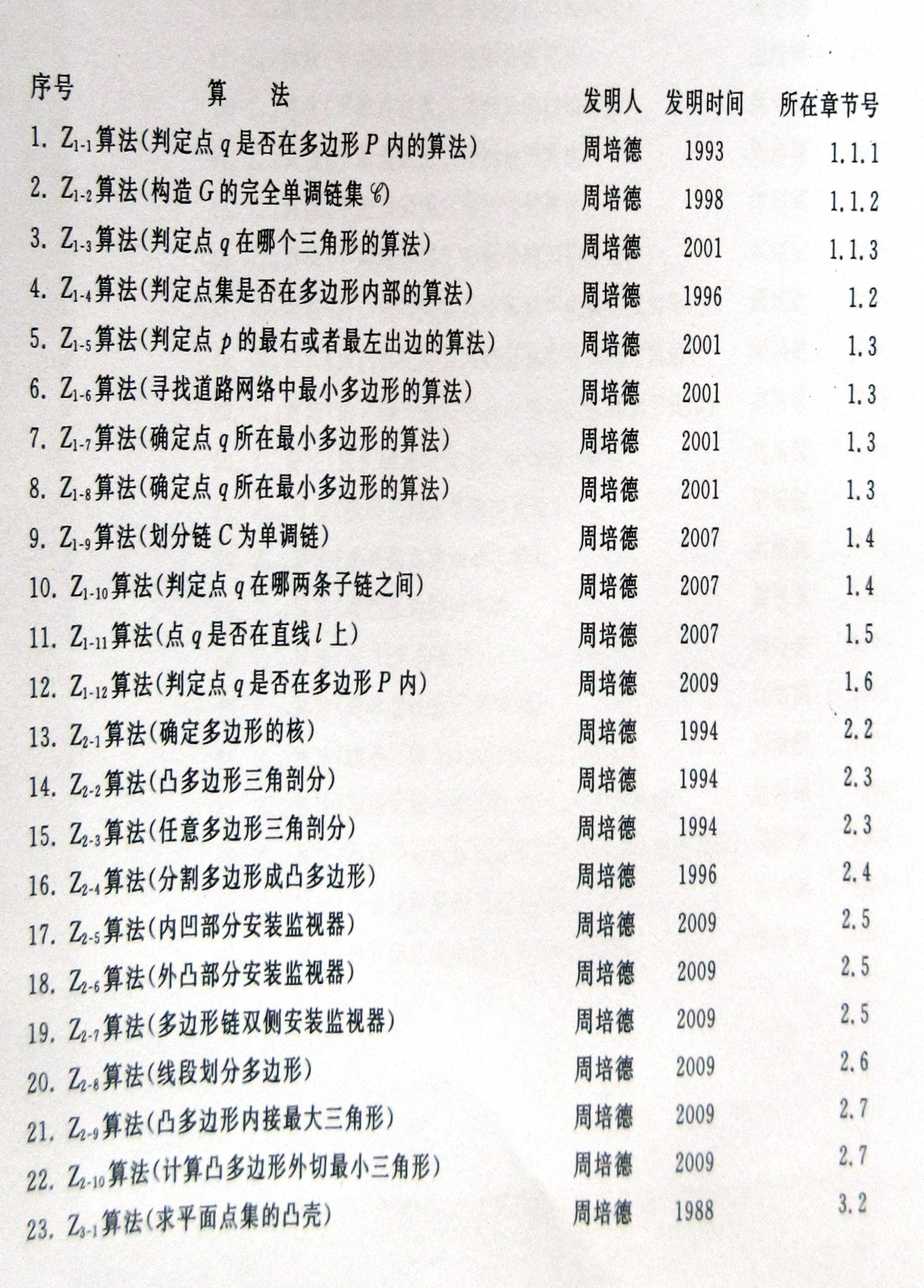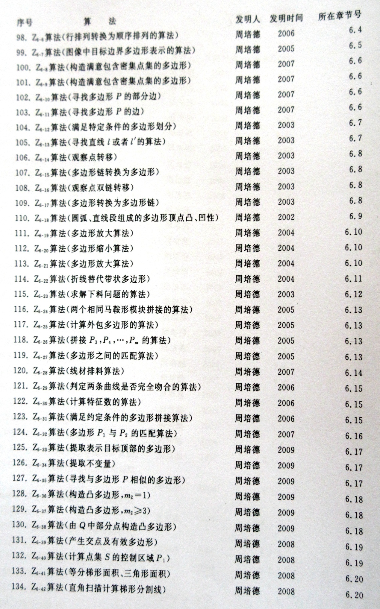周培德教授虽然已经退休十余年,但他一直没有停止对计算几何算法的研究工作。截止2016年1月,周教授独立发明计算几何算法506个,这些算法涉及到图形处理的方方面面(部分算法名称见附录),具有极强的实用性。为拓展这些算法的应用,也为青年科技人员拓展一个研究途径,欢迎从事图形处理及相关领域科研的教师和学生到咨询室开展咨询,同时也欢迎有课题的研究人员提出与计算几何算法相关的问题进行共同研讨。