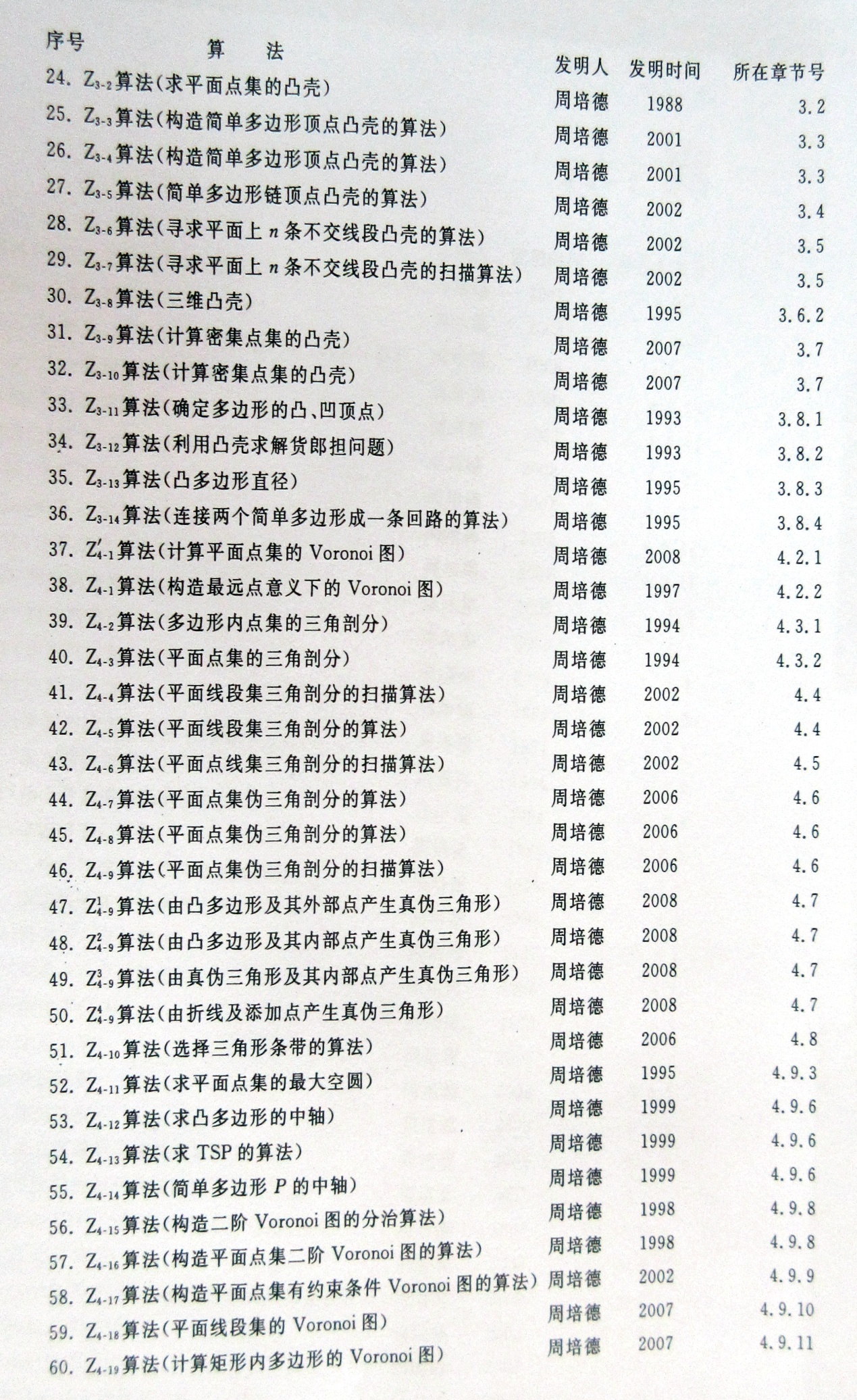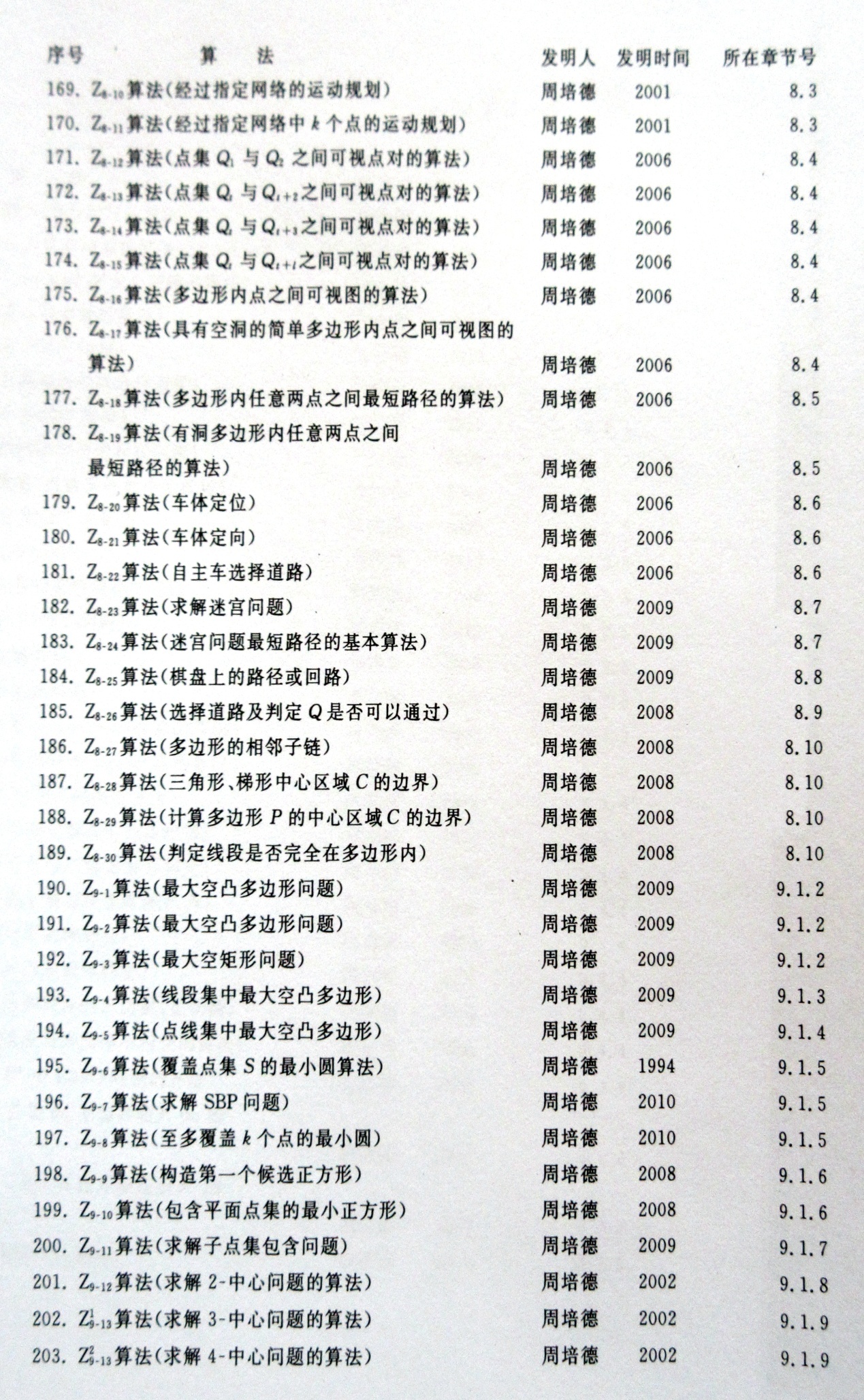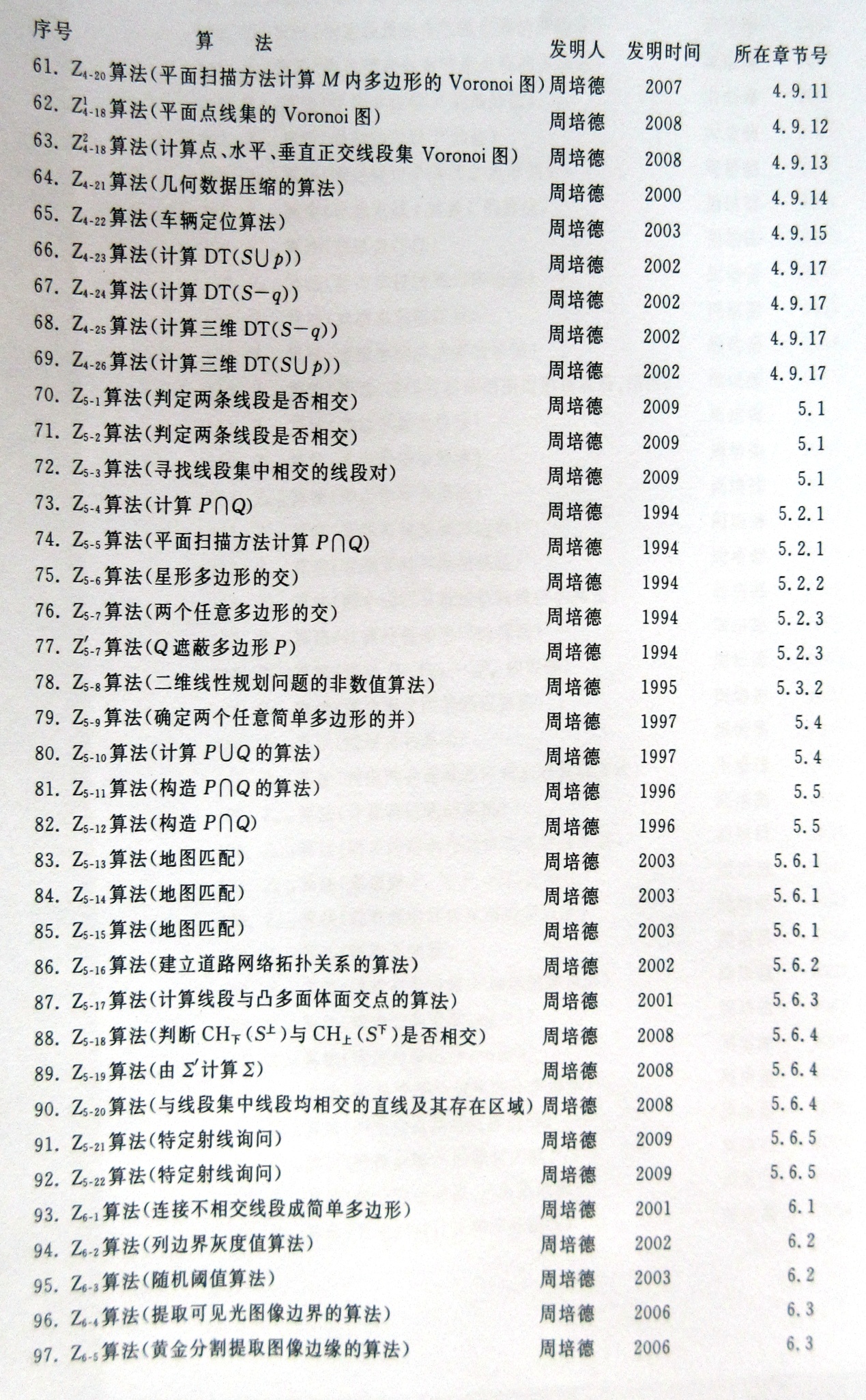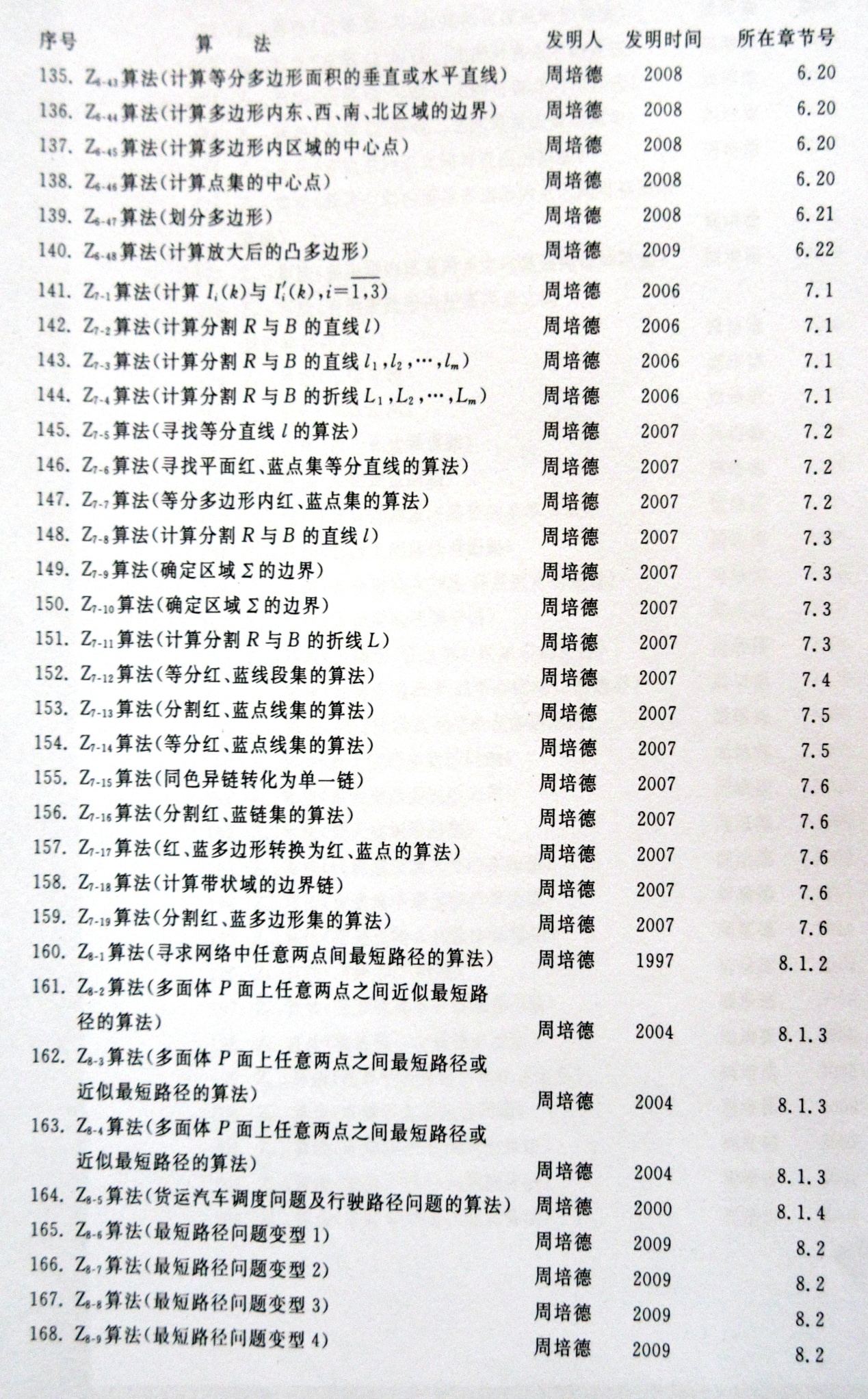 周培德教授虽然已经退休十余年,但他一直没有停止对计算几何算法的研究工作。截止2016年1月,周教授独立发明计算几何算法506个,这些算法涉及到图形处理的方方面面(部分算法名称见附录),具有极强的实用性。为拓展这些算法的应用,也为青年科技人员拓展一个研究途径,欢迎从事图形处理及相关领域科研的教师和学生到咨询室开展咨询,同时也欢迎有课题的研究人员提出与计算几何算法相关的问题进行共同研讨。
