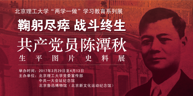 即日起至4月13日,“鞠躬尽瘁 战斗终生——共产党员陈潭秋生平图片史料展”在良乡校区艺术馆展出。本次展览由校党委宣传部、中共一大会址纪念馆和北京鲁迅博物馆(北京新文化运动纪念馆)联合举办。欢迎全校师生莅临参观学习! 该展览作为我校“两学一做”学习教育系列展之一,也欢迎全校各级党组织结合学习教育工作安排,组织师生党员参观学习。