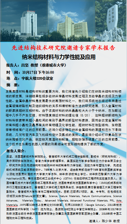 【先进结构技术研究院】香港城市大学吕坚教授讲座预告