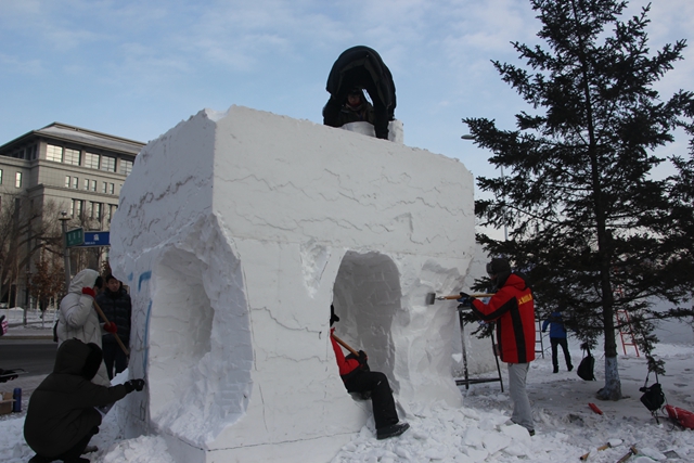 “有个队的雪雕塌了,我们要不要继续掏下去?”在国际大学生雪雕大赛现场,队员刘伟松问。
