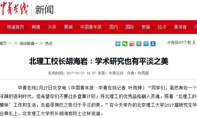 【中青在线】北理工校长胡海岩:学术研究也有平淡之美