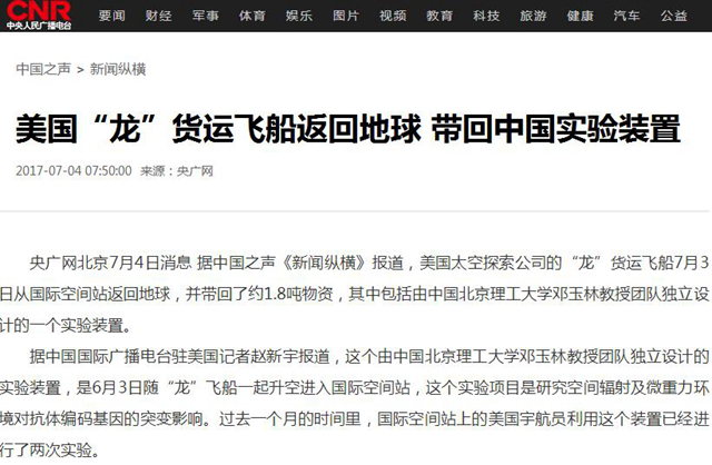 【央广网】美国“龙”货运飞船返回地球 带回北理工实验装置