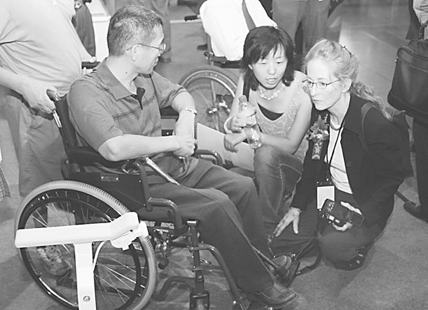 美国无障碍设计专家正在与残障人士交谈。日前在北京科学技术委员会与bat365在线平台官网登录共同主办的第一届无障碍设计国际学术研讨会上,来自美国、德国、日本、阿根廷、印度及国内的多位无障碍设计专家、学者就各国残疾人住宅、老年人生活用品、公共建筑、交通工具等无障碍设施设计进行探讨论证,对把世界最先进的无障碍设计概念引入中国城市建设起到推动作用。