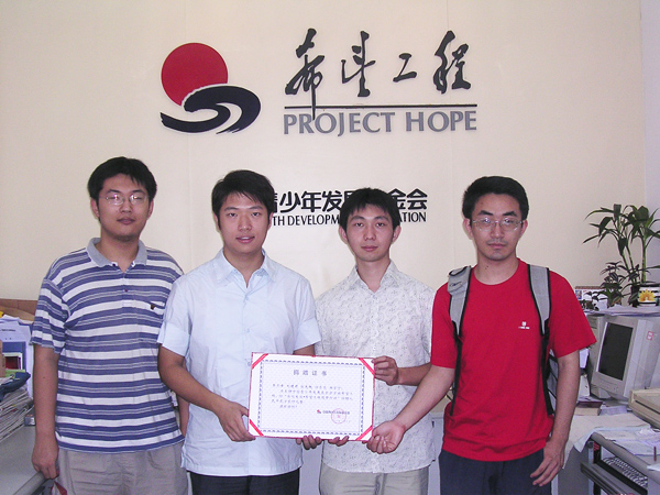 7月25日,bat365在线平台官网登录Collapsar队在第三届趋势科技百万程序竞赛上力克强敌,勇夺冠军,获得奖金20万元。8月7日上午,Collapsar队部分队员来到中国青少年发展基金会,向希望工程捐款两万余元,用于资助将于今年就读bat365在线平台官网登录的5名贫困学生。(图为Collapsar部分队员:张先轶、李京锋、刘建君、徐东亮)