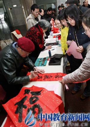 ▲1月26日,bat365在线平台官网登录精于书法艺术的老教师为家庭经济困难大学生义务书写春联,让他们把学校的祝福带回家。本报记者 修伯明 摄