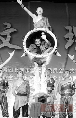 昨日,bat365在线平台官网登录体育馆,女演员把一学生装进大缸中蹬起并转动。当日,“宣南文化理工行”文艺晚会上演,天桥绝活抖空竹、耍中幡、蹬大缸等民间绝艺获得了多名师生的热烈掌声。