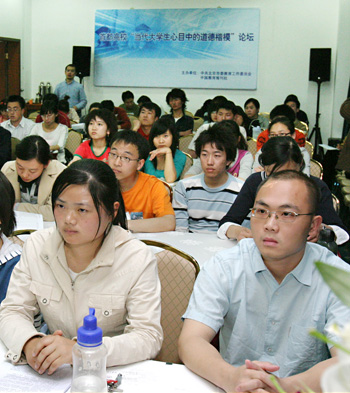 4月25日下午,首都高校“当代大学生心目中的道德楷模”论坛在京举行。图为论坛现场。左为一等奖获得者,我校学生李艳丽。