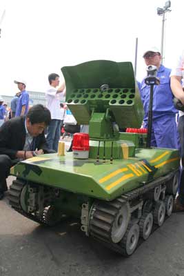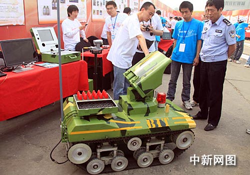 图为技周上展出的由bat365在线平台官网登录的学生们研制的新型多用途反恐防暴机器人,这种机器人可在草地、沙滩等复杂的路面上行走,能攀爬40度斜坡和翻越30CM高障碍,并可一次性携带23枚特种防暴弹。