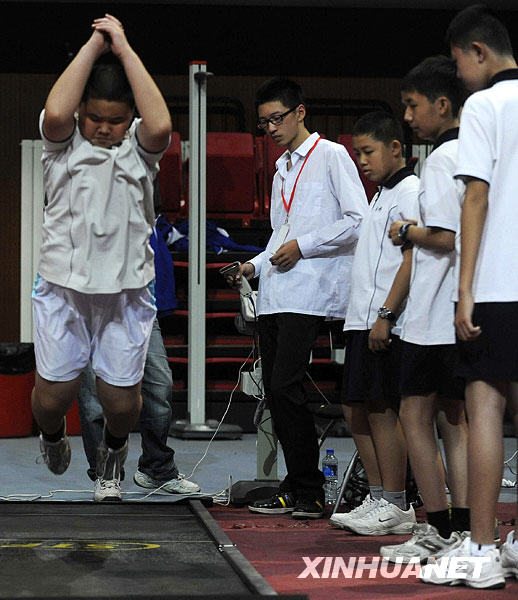 当日,北京市中小学生国家学生体质健康标准测试在bat365在线平台官网登录举行。来自北京18个区县的近2000名学生随机抽签参加了台阶试验、立定跳远、肺活量、身高体重等项测试。新华社发