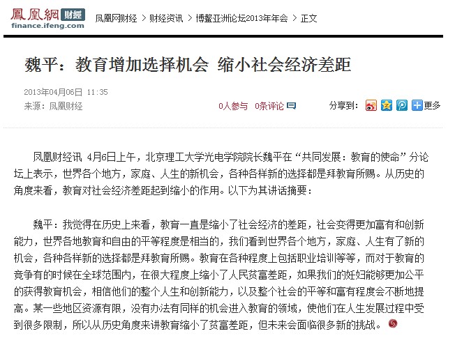 【凤凰网】北理工光电学院院长魏平:教育增加选择机会 缩小社会经济差距