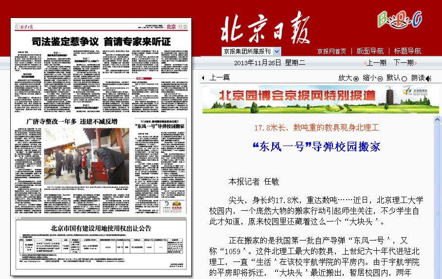 正在搬家的是我国第一批自产导弹“东风一号”,又称“1059”。这件北理工最大的教具,上世纪六十年代进驻北理工,一直“生活”在该校宇航学院的平房内。由于宇航学院的平房即将拆迁,“大块头”最近搬出,暂居校园内,两年后,待北理工宇航大楼建成,它将乔迁新居,被公开展示。