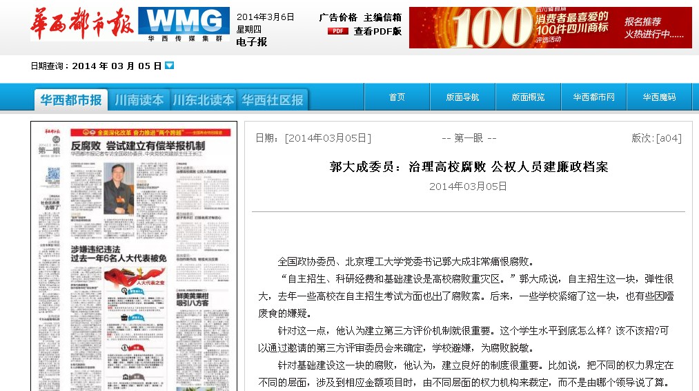 【华西都市报】北理工党委书记郭大成:治理高校腐败 公权人员建廉政档案