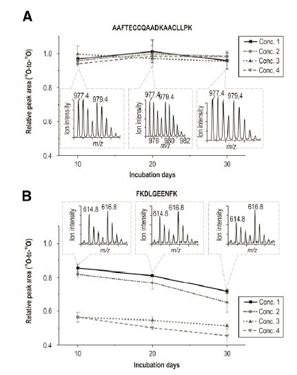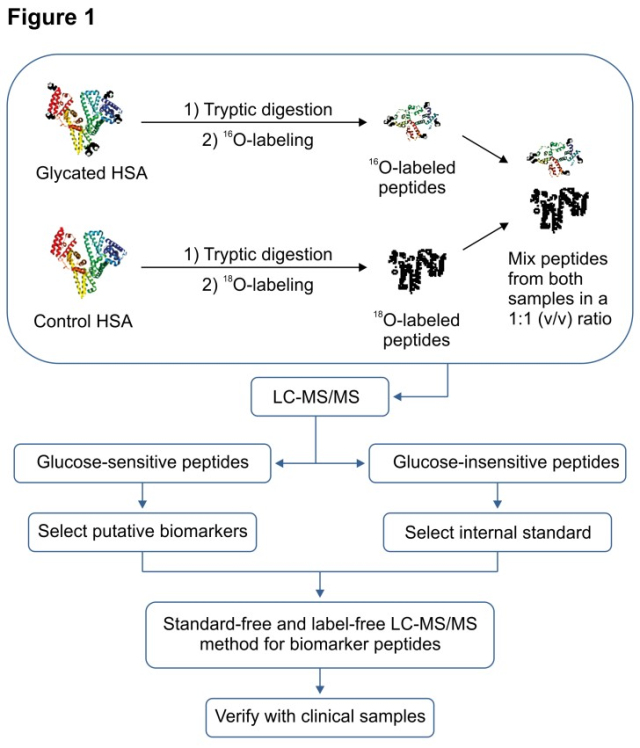 在具体的实验研究中,生命学院的师生们首先以标准人血清白蛋白与葡萄糖建立体外模拟糖基化模型,酶切后通过18O标记的方法,经高效液相色谱质谱(LC-MS/MS)定量检测后分别筛选出葡萄糖敏感肽段和葡萄糖不敏感肽段。葡萄糖敏感肽段即为初步筛选出的候选生物标志物,而葡萄糖不敏感肽段因不易被葡萄糖修饰,可在下一步的血浆样本验证中被用作“内标”肽段,用以衡量其它葡萄糖敏感肽段的变化程度,从而进一步筛选出有望作为糖尿病早期诊断的生物标志物。