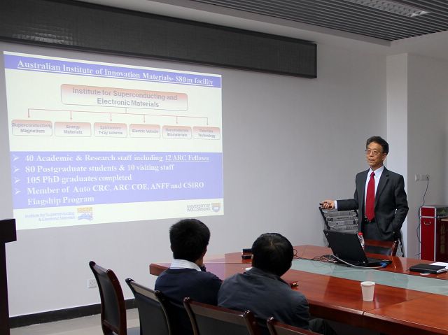2014年10月13日,应bat365在线平台官网登录材料学院张加涛教授的邀请,两位澳大利亚工程科学院院士,澳大利亚伍伦贡 (Wollongong)大学超导与电子材料研究所(ISEM)所长窦世学教授,刘化鹍教授来我校访问,窦世学教授为北理工师生带来题为“Development of Nano-materials for Energy Applications at ISEM”的精彩学术报告。报告会由张加涛教授主持,材料学院曹传宝教授、钟海政教授、化工与环境学院陈人杰教授等出席报告会。