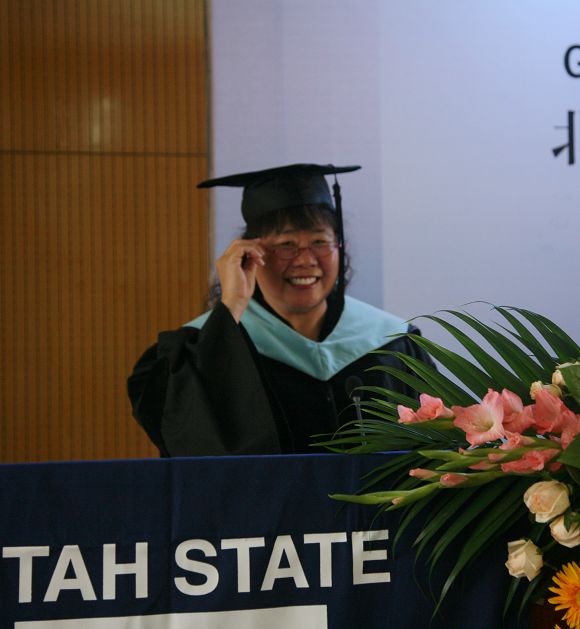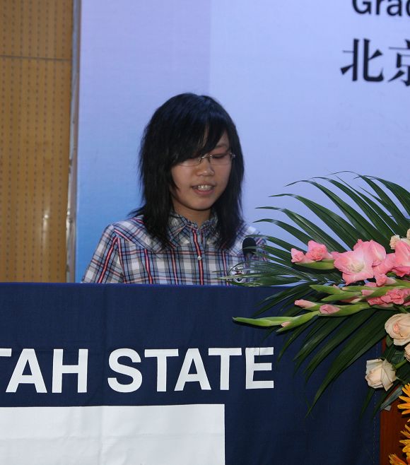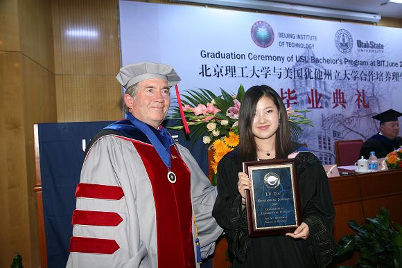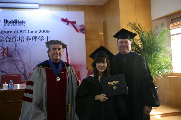 在优美的毕业音乐声中,犹他州立大学国际合作教育部主任Li Li博士宣读了毕业生名单,副教务长Edward Reeve博士和Dwight Israelsen教授给毕业生颁发了学士学位证书并一一合影留念。Li Li博士代表犹他州立大学董事会宣布全体学生毕业,获得了犹他州立大学理学士学位。随后, Dwight Israelsen教授代表犹他州立大学Jon M. Huntsman商学院授予吕游同学2009年度杰出毕业生称号,并颁发犹他州立大学Jon M. Huntsman商学院杰出毕业生奖牌。