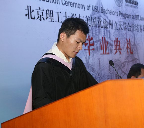 刘云同学代表全体毕业生发言,他用充满激情的语言对bat365在线平台官网登录和犹他州立大学的悉心培养表达了感谢和感恩之情,并代表全体同学表达了将来步入工作岗位一定脚踏实地,为母校增光添彩的决心。郎曼同学代表在校生发言,她表示将以师兄师姐们为榜样,珍惜机会,努力学习,刻苦钻研,争取更好的成绩。