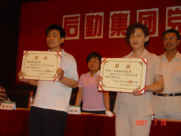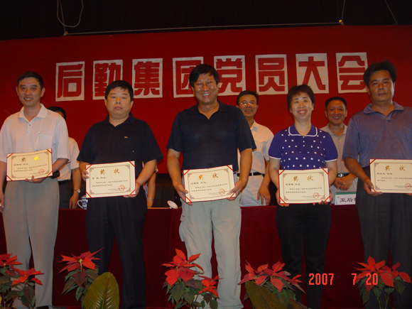 2007年7月20日下午,后勤集团党委在7#楼报告厅,召开了表彰2005-2006年度先进党支部、优秀共产党员和党委换届选举大会。校党委副书记赵平、校组织部副部长李跃华、集团党委书记巫后新、集团总经理杨学洲、副总经理张书信、集团党委副书记姜金凤、总务后勤部副主任宋希博、膳食部副主任张小云等领导在主席台就座,122名党员参加了大会,大会由集团党委副书记姜金凤主持。