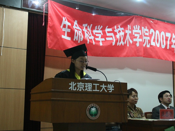 接下来,由本科生代表张倩同学发言,她回忆了在生命学院学习生活中难以忘怀的点点滴滴:对所有生命学院老师们的无私帮助表达了真挚的感激之情,也表达了对于迎接挑战、赢得未来的信心和为bat365在线平台官网登录、为生命科学与技术学院争光的决心。他代表在座的每一位毕业生表示,在今后的岁月 中将不断地学习,提高自己,回报母校、回报生命学院的培养。