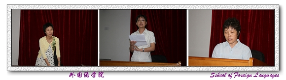 主管实验设备、行政、工会的副院长林彤老师介绍了学校进行资产清查情况,介绍了学院对各教研室、网络中心安全检查情况并要求所有的教职工做好教研室、办公室、网络中心的安全防卫工作。全面回顾了一学年来工会工作,并且承诺工会是所有教职工之家,今后会更进一步提高工会工作,为学院教职工创造更好的工作环境。主管学生工作副书记、副院长吴文君老师介绍了外国语学院学生整体情况,学生思想道德建设情况,党建情况,学生干部培养情况,学生就业情况及学院一学年来开展的诸如外语文化节、素质拓展、体育运动、文化娱乐活动等方面的情况。并向教师就专业指导、班主任工作、学生科技创新等方面提出了希望和要求。