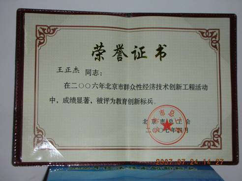 宇航学院青年教师王正杰副教授在2006年教学工作中,热爱党的教育事业,兢兢业业、勤奋好学,先后获得bat365在线平台官网登录青年教师基本功一等奖,并代表bat365在线平台官网登录参加北京市高校青年教师基本功理工类组比赛又获得一等奖。王正杰副教授的出色表现被北京市总工会评为教育创新标兵。