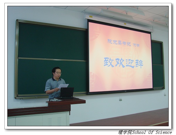 典礼首先由理学院党委书记何明致欢迎辞,他首先对理学院2007级新生的到来表示热烈的欢迎,并希望同学们能够胸怀祖国、树立远大理想、不断自立自强,勤于学习、善于创造、甘于奉献,在服务祖国人民的伟大实践中实现自身价值。