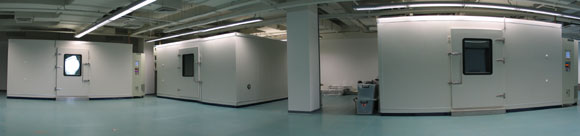 噪音实验室的背景噪音为12分贝,除了墙面的吸音和隔音处理外,还要隔绝外界低频振动能量向实验室内部的传递。在这个实验室内可以使用制具和麦克风进行声功率的测试,使用标准噪音测试桌和麦克风进行电脑声压的测试。