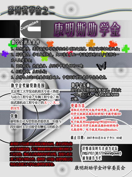 本年度的康明斯助学金申报工作已经开始,校本部同学将书面材料交到1号教学楼343王泰鹏老师处,电子版发到wangtaipeng1985@163.com;良乡校区同学将书面材料交到李文彪老师处,电子版发到sira@bit.edu.cn。评审委员会将会根据各位同学的申报材料综合考虑经济状况和学习状况进行评选,选出相对较符合条件的候选人并将专业、名单进行公示,对有异议者进行核实,有必要者进行更换再公示,最终将获奖名单报送企业。
