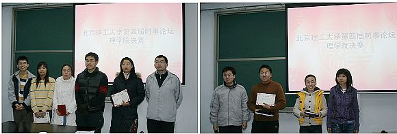 当晚担任评委工作的有理学院分团委安泰老师、卢俊峰老师,理学院马列主义学习会前任会长吕俊均、副会长王丽、陈家烦和马学会现任会长高永浩、副会长宋菲菲、翟富臣以及第二届时事论坛坛主张齐等。与前三届的情况不同的是,本届时事论坛的主旋律侧重于大学生切身生活的方方面面的思考,虽无第一届的“三农问题”的催人泪下,亦无第二届的“矿难” 的沉重悲怆和第三届的“青藏铁路”的气势磅礴,但同样涌现出了许多诸如“韩流来袭”、“失落的幸福”、“浅谈延安精神”、“生态文明”等精彩犀利的论断评述,还有如“香港十年”、“紫荆花开十年”、“农民工”、“歼10战鹰”等近期国内外的时事论点的精彩论述。参赛选手个性十足,有的慷慨激昂,有的气定神闲,或针砭时弊,或高咏颂歌,流畅的演说伴着幻灯片的烘托,肆意游走在古代与现代、庄重于奇趣的广阔疆场,绕梁三日,不绝于耳,令人徜徉,久久回味。