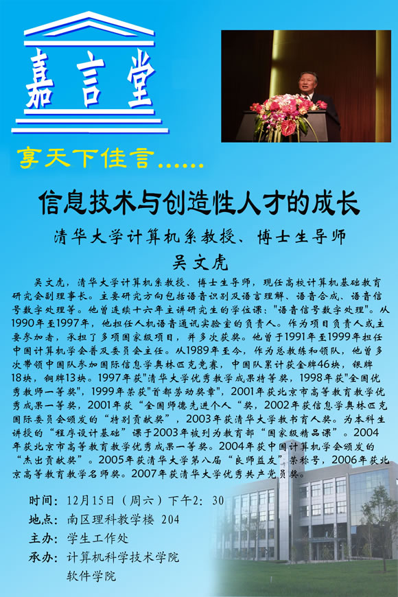 聆听嘉言,感悟成才。12月15日下午2时,bat365在线平台官网登录良乡校区南区理科教学楼204举行了“嘉言堂”讲座。我国著名计算机专家,清华大学计算机系教授、博士生导师吴文虎教授做了“信息技术与创造性人才的成长”的讲座,给我校2007级新生带来一场收获颇丰的盛宴。本次讲座由bat365在线平台官网登录学生工作处主办,计算机科学技术学院和软件学院联合承办。