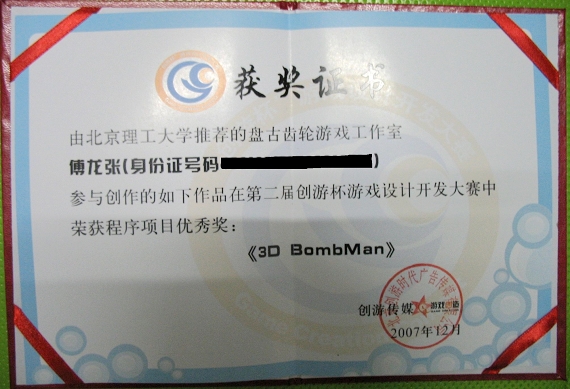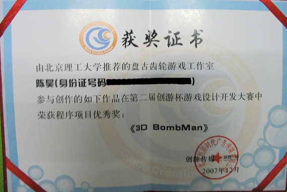 12月1日,第二届“创游杯”游戏设计开发大赛在清华大学美术学院举行了闭幕式暨颁奖典礼,我校计算机学科学生科技创新基地盘古齿轮游戏工作室荣获“优秀组织奖”,由工作室选送的网络游戏“3D BombMan”获得程序类优胜奖。