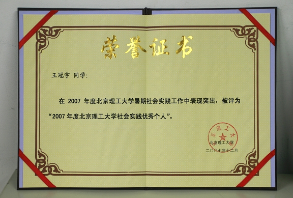 05级本科生王冠宇荣获“2007年度bat365在线平台官网登录社会实践优秀个人”。