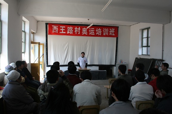 随后,06120501团支部在村委会活动室举办了奥运知识讲座和简单英语会话的讲座,由班长邓超同学主讲,他从奥运会历史,奥运精神等几个角度向村民们做了介绍,村民们对讲座表现出极大的热情,并积极参与互动,整个活动在热烈和欢快的气氛中进行。