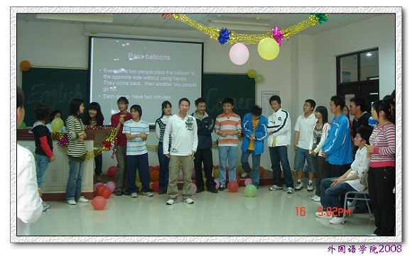 此次外语角共有“group talk”、“传气球”、“英文绕口令”、“心有灵犀”等节目,使前来参加的同学不仅锻炼了口语,更是参与了好玩刺激的游戏。