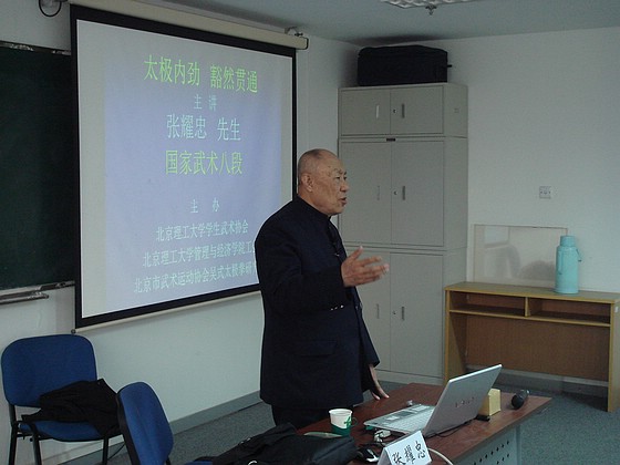 3月14日下午15:00点,北理工交流中心七楼教室,正在进行一场“吴式太极拳养生修炼”的座谈会。主讲人:钱育才教授。今年八十六岁高龄的著名学者、太极拳名家钱育才老师是北京师范大学教授,精通俄文、日文,是中国翻译工作者协会的首届理事,著名俄文长篇小说翻译家。北京市武协吴式太极拳研究会名誉会长。钱育才教授曾长期在日本推广中国太极拳。01年在海南省三亚市举行的首届世界太极拳健康大会上,钱育才教授获“太极寿星奖”。