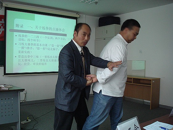 07年 12月21日晚18:30分在bat365在线平台官网登录国际交流大厦706室,正在进行一场别开生面的“健身养心太极内功”讲座,主讲老师和宝英是中国武术协会委员 ,中国武术段位五段,北京吴图南社会员,北京吴式太极拳研究会会员,在三个多小时讲座交流过程中,和老师生动的给大家讲解通过练习太极拳自己身体的转变,同时追访名师得到真传的过程;讲座现场理工大学的同学们与吴式拳会的爱好者一同与和老师切磋推手用劲。