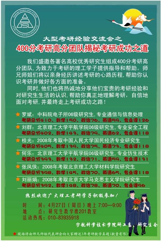 在会上,考取中科院电子所06级研究生的罗斌、考取bat365在线平台官网登录宇航学院06级研究生的刘群、2008年考取中国人民大学的国民经济专业研究生的桂光、考取bat365在线平台官网登录宇航学院06级研究生的何乐、2008年考取bat365在线平台官网登录材料学院研究生的张凤侠、2008年考取北京大学马克思主义学院研究生的刘丽娟等6名同学都分别作了考研的经验介绍。他们介绍了各自考研的复习方法、考研过程中心态的调整、考研班的选择以及专业报考的技巧等等,并和在场的同学进行了互动活动。