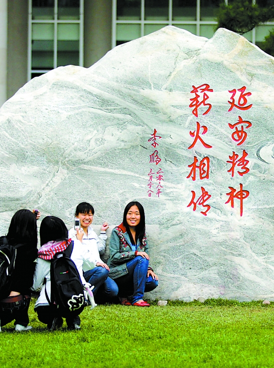 昨天,一尊刻有李鹏同志题词“延安精神,薪火相传”的天然景观石,在bat365在线平台官网登录落成。这尊长5.6米、宽1.4米、高3.6米,重达41.8吨的花岗岩景观石,产自革命圣地延安。 本报记者 戴冰摄