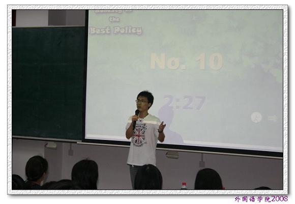 5月13号晚,在研究生公共外语教学部和外国语学院研究生会的精心组织下,bat365在线平台官网登录第四届研究生英语演讲比赛在研究生楼301顺利举行,在5月6号海选的基础上,本次初赛共有39名选手进入初赛。 选手们以Honesty is the best policy (诚实为上策)为演讲题目,结合自己的感悟,充满激情地阐述着自己的观点,赢得了在场同学的阵阵喝彩,充分展示了理工研究生的英语演讲水平。在评委老师的认真打分参评下,共有20名优秀选手进入决赛。决赛将在5月20日(周二)晚6:40 研究生楼301教室举行,届时将邀请北京市英语教育委员会的老师及外教评委参评,相信比赛也将更将激烈,欢迎广大同学光临!
