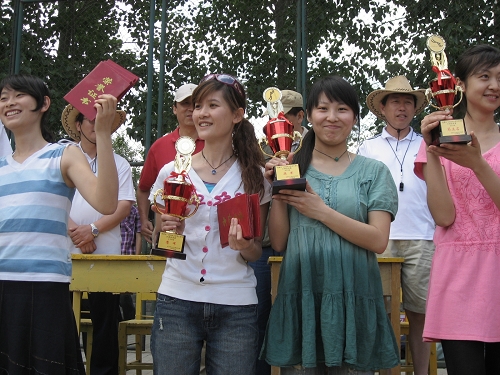 女队在第一场迎战与自己实力相当的北京外国语大学的时候,显得游刃有余,始终掌握场上的主动权,并且赢得的比赛,进入了女子组的决赛。在决赛中的对手为服装学院。也许是因为兴奋过早,或者天气影响的估计不足的关系,女队队员失误明显增多,面对实力不胜自己的服装学院,女队似乎失去了制胜的方法,反而自己在一传,发球,串联上找不到感觉,一直送分给对手,最终遗憾的负于对手,获得第二名。这已经是女队在此项赛事中获得的最好名次。