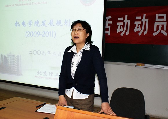 栗苹副院长在会上介绍了“机电学院发展规划(2009-2011)”,包括机电学院目前的基本现状和基本特性,提出了未来三年学院的发展规划和发展目标。指出,要以学科建设为核心,加强学科的顶层设计,强化学科的优势和特色,凝炼和开拓新的学科方向,加强大师级人才、学科带头人的培养和引进,加强创新团队建设,努力建好学科基地和平台,推进体制机制创新和文化建设,培养高质量的人才,出高水平的科研成果,提升学术水平和地位,保持兵器科学与技术学科第一的地位,使学院成为引领兵器科学与技术学科和技术发展的基地。栗苹副院长还向全院教工传达了胡海岩校长校七届二次教代会十二届二次工代会暨2009年学校工作会议上的报告精神。最后栗苹副院长介绍了机电学院当前面临的几项重要工作,也希望全院教职工在当前的学习实践活动中,为学院发展建言献策,共同为学院发展做贡献。