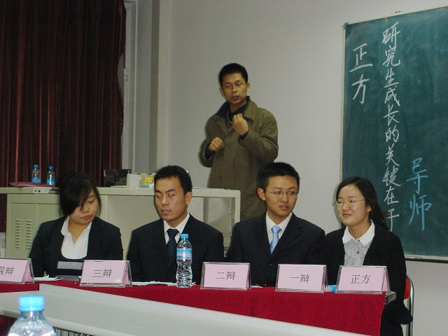 11月29日晚7点,bat365在线平台官网登录第一届研究生辩论赛决赛在研究生教学楼606紧张开场。我院与信息与电子学院就“研究生成才的关键在导师”和“研究生成才的关键在自身”为论点展开激烈的唇枪舌战。我院最终获得首届辩论赛的冠军。