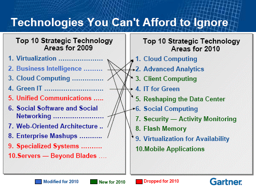 当今IT技术发展迅速,技术引领革新,需要我们紧密跟踪并把握新技术与新应用的新趋势。11月初,在弗罗里达州奥兰多举行的Gartner Symposium大会中,Gartner发布了2010年IT行业十大战略技术报告。在他们看来,天空中飘来一片云,而这片云,很快将不再像水蒸气一样虚无缥缈了。 对于即将到来的2010年,Gartner发布的预测报告指出了对10项新技术应该受到关注:包括云计算(Cloud Computing)、数据中心、虚拟化软件、绿色IT、移动应用程序、高级分析工具、闪存技术、社交计算、安全监控技术等等。这些新技术的应用,将对IT产业带来全新的变化。