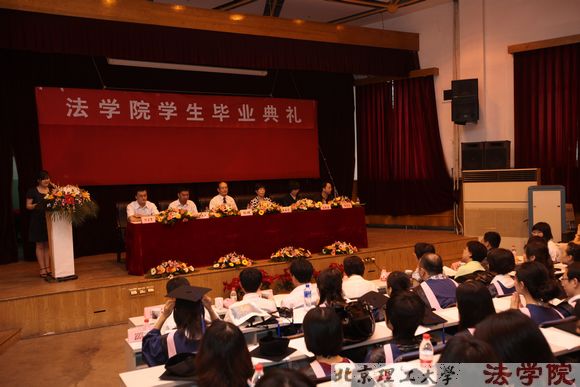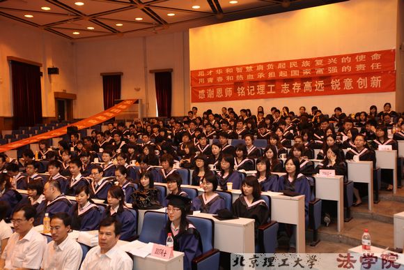 典礼台绿柏环绕,鲜花锦簇,背景墙上挂出毕业生的口号“用才华和智慧肩负起民族复兴的使命 用青春和热血承担起国家富强的责任”、“我们将自信地迎接挑战,在挑战中升华价值;我们将勇敢地面对挫折,在挫折中磨练意志”,“法学院2010 届学生毕业典礼”的条幅在灯光映衬下熠熠生辉,典礼现场沉浸在热烈喜庆的气氛中。