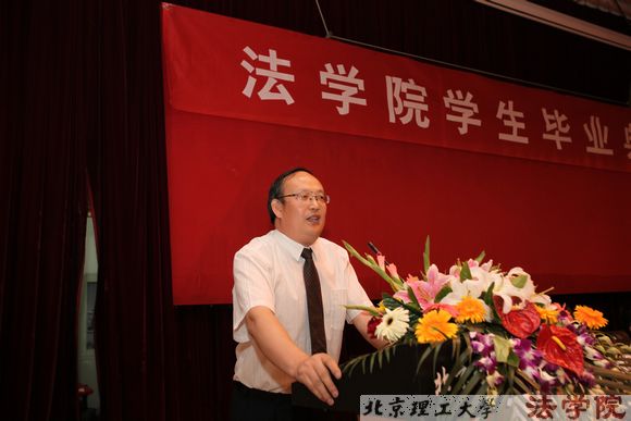 毕业典礼上,教师代表郭德忠老师以“物质化时代的法律人”为题发言,希望毕业生“堂堂正正做人,踏踏实实做事”,并祝贺毕业生圆满完成学业;优秀校友代表96级毕业生、现任 百泰酒业副总裁刘巍发言,表达了对母校的深深怀念和对学弟学妹们的真挚祝福;本科毕业生代表舒歆同学发言,表达了全体毕业生对学校领导和老师的感激之情和崇高敬意;研究生毕业生代表姜琨琨发言,表达了对母校的留恋和对同窗未来的祝愿,并带领全体毕业生宣誓,“传承谦虚谨慎、自强不息的理工传统;发扬团结勤奋、求实创新的理工精神;志存高远,锐意创新;勤勉做事,谦虚为人。用才华和智慧肩负起民族复兴的使命;用青春和热血承担起国家富强的责任。”的豪言壮语在报告厅中回响。