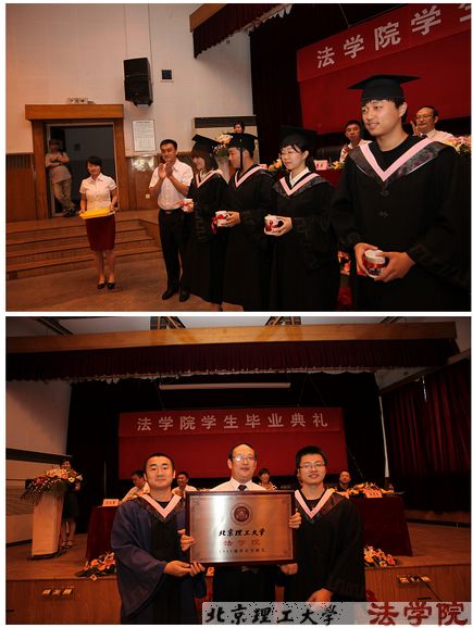 毕业典礼在庄严的国歌声中开始。庞海芍书记致辞,表达了对毕业生的祝贺,并希望他们把母校当做第二个家园常回来看看。副院长李寿平教授、张艳丽教授分别宣读了对2010届授予硕士、学士学位及法学二学位、双学位的决定,党委副书记、副院长付大军老师宣读了市级优秀毕业生、校级优秀毕业生给予表彰的决定。在随后进行的颁奖、授位仪式上,学院领导、教授为每一位毕业生颁发证书,拨流苏,祝贺他们完成学业。