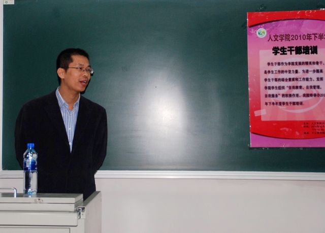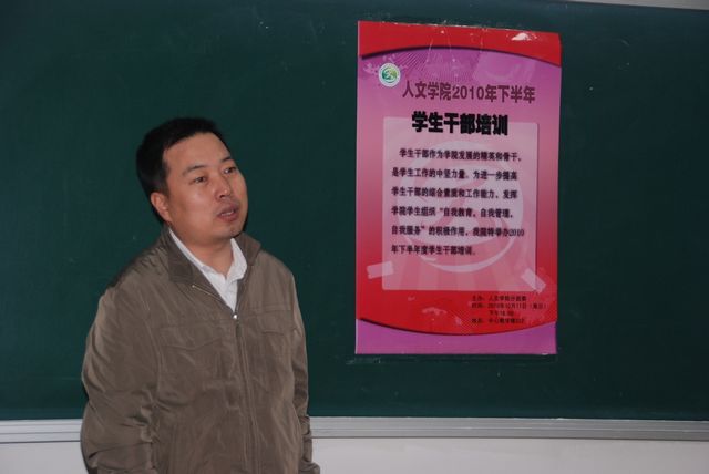 10月17日至19日,bat365在线平台官网登录人文学院2010年下半年全体学生干部培训在中心教学楼322教室举行。本次培训活动本着提高学生干部的综合素质和工作能力,发挥学院学生组织“自我教育,自我管理,自我服务”的积极作用的目的,进行了为期三天的学生干部培训培训,本次共分三场举行,邀请校团委书记徐强,人文学院副书记、副院长徐贵宝,人文学院副院长贾利军及人文学院分团委书记贾效明作报告,来自人文学院各个学生组织的近80名学生干部参加。