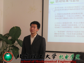 会上,机电学院各学生组织负责人分别就本学期学生工作和社团活动作了总结,同时就下学期工作活动进行了规划与展望。学生分团委副书记邵建锟全面总结了在过去半年中分团委所展开的一系列活动和为其他学生组织和社团提供的后勤工作,表示2011年将在继续日常工作的基础上加强精品活动的举办,重点强调要确立规范,形成制度化、常态化的日常工作流程。